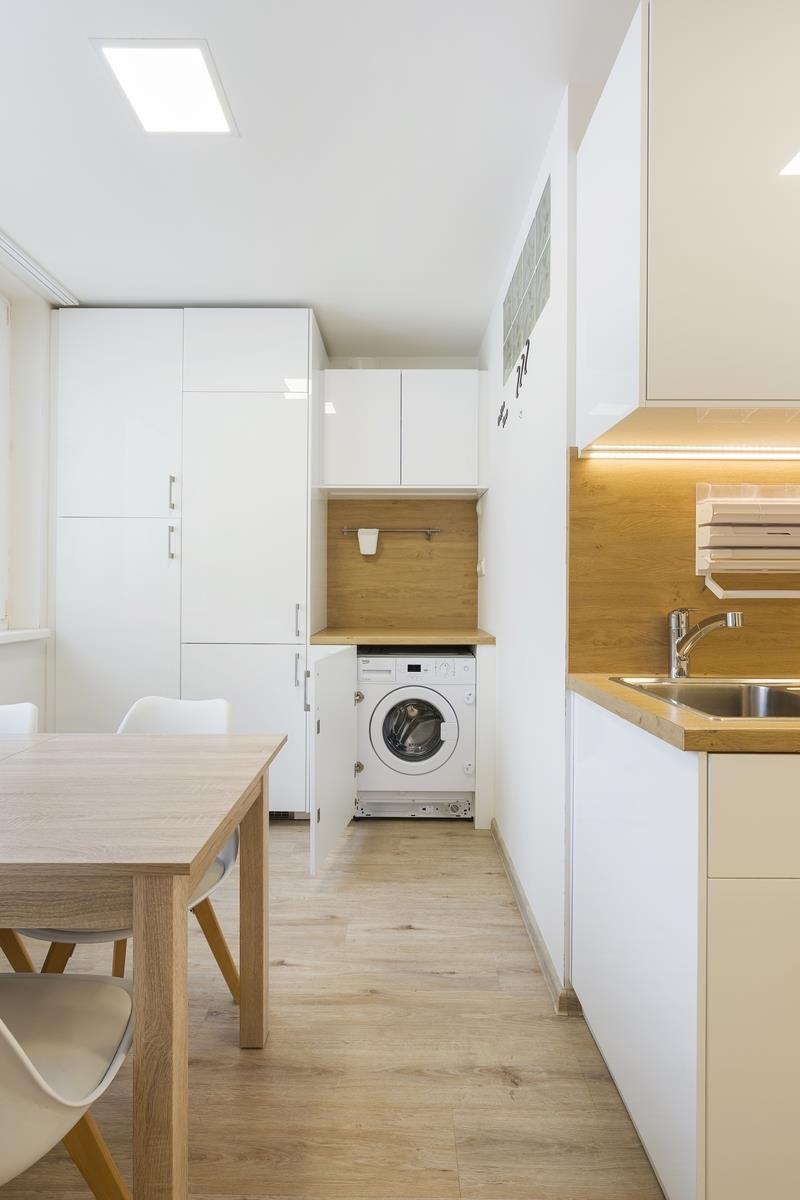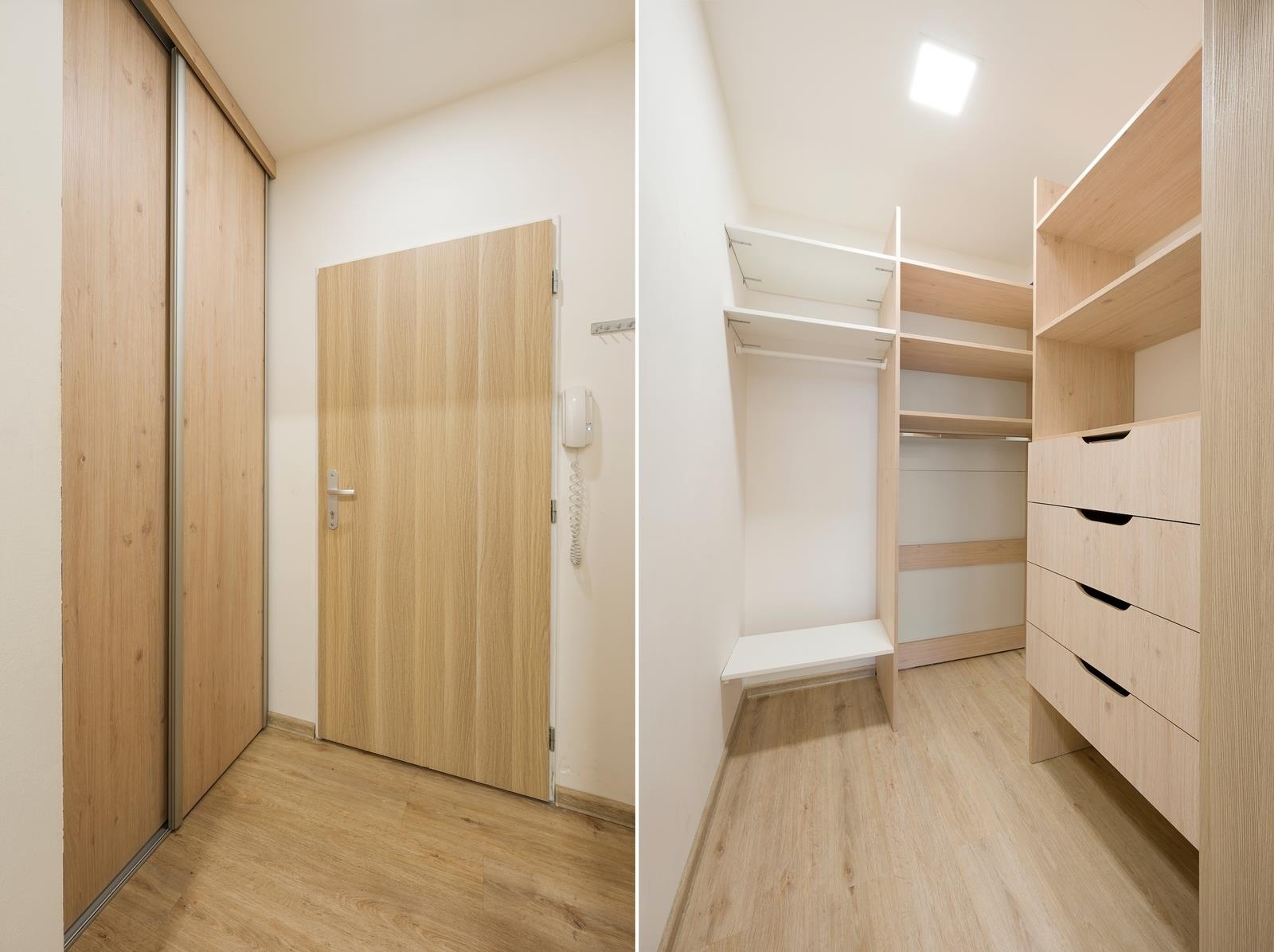 Vybavená kuchyně: myčka, lednice, trouba, plyn. varná deska, digestoř a také pračka. Prostorné a vybavené pokoje: obývací pokoj - sedačka, konferenční stolek, TV stolek, skříňky nad TV stolkem, kuchyň - stůl a židle, šatna - police a šuplíky na míru, chodba - vestavná šatní skříň a koupelna s vanou. V bytovém domě jsou rozvody TV a internetu.
