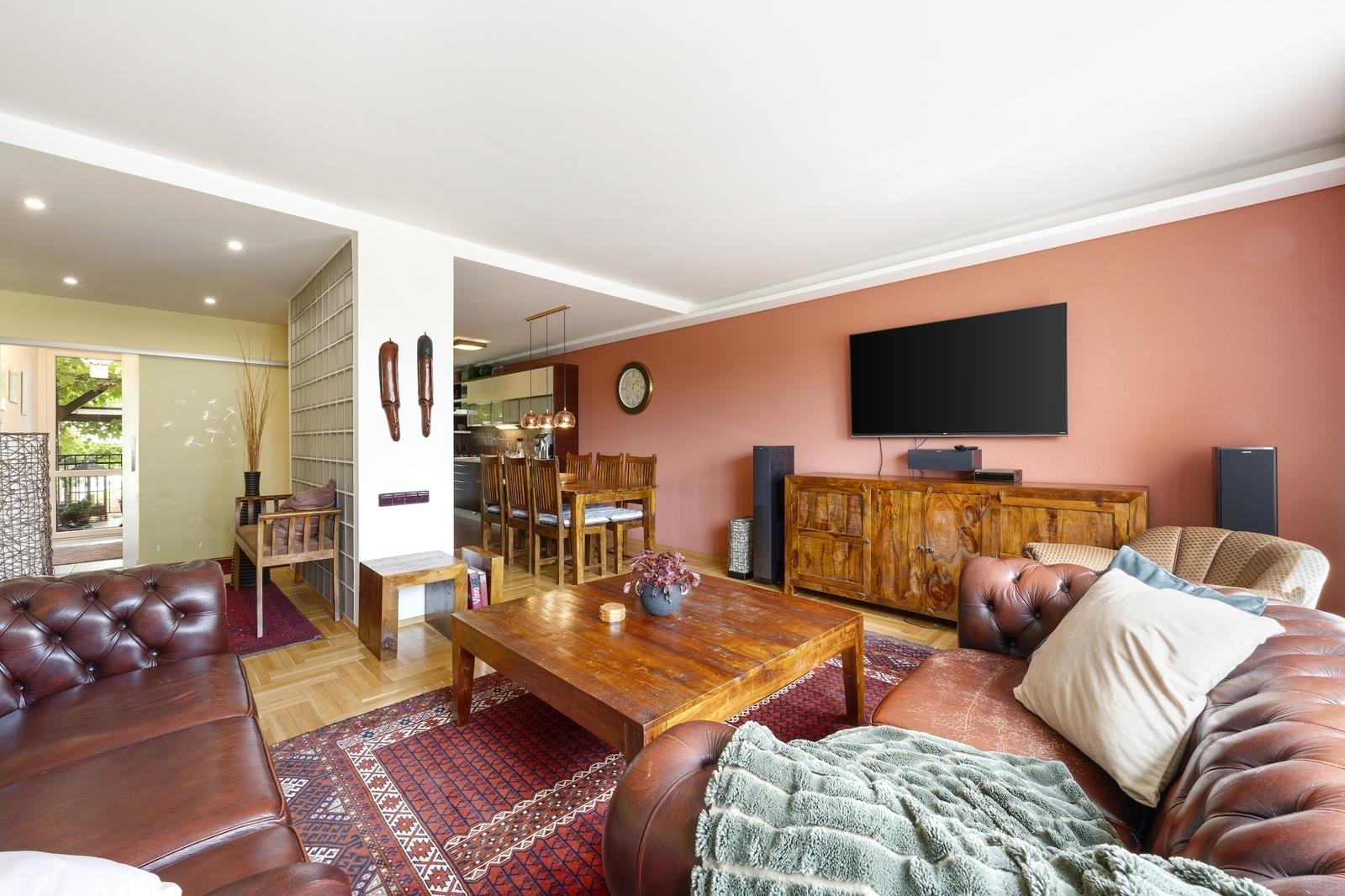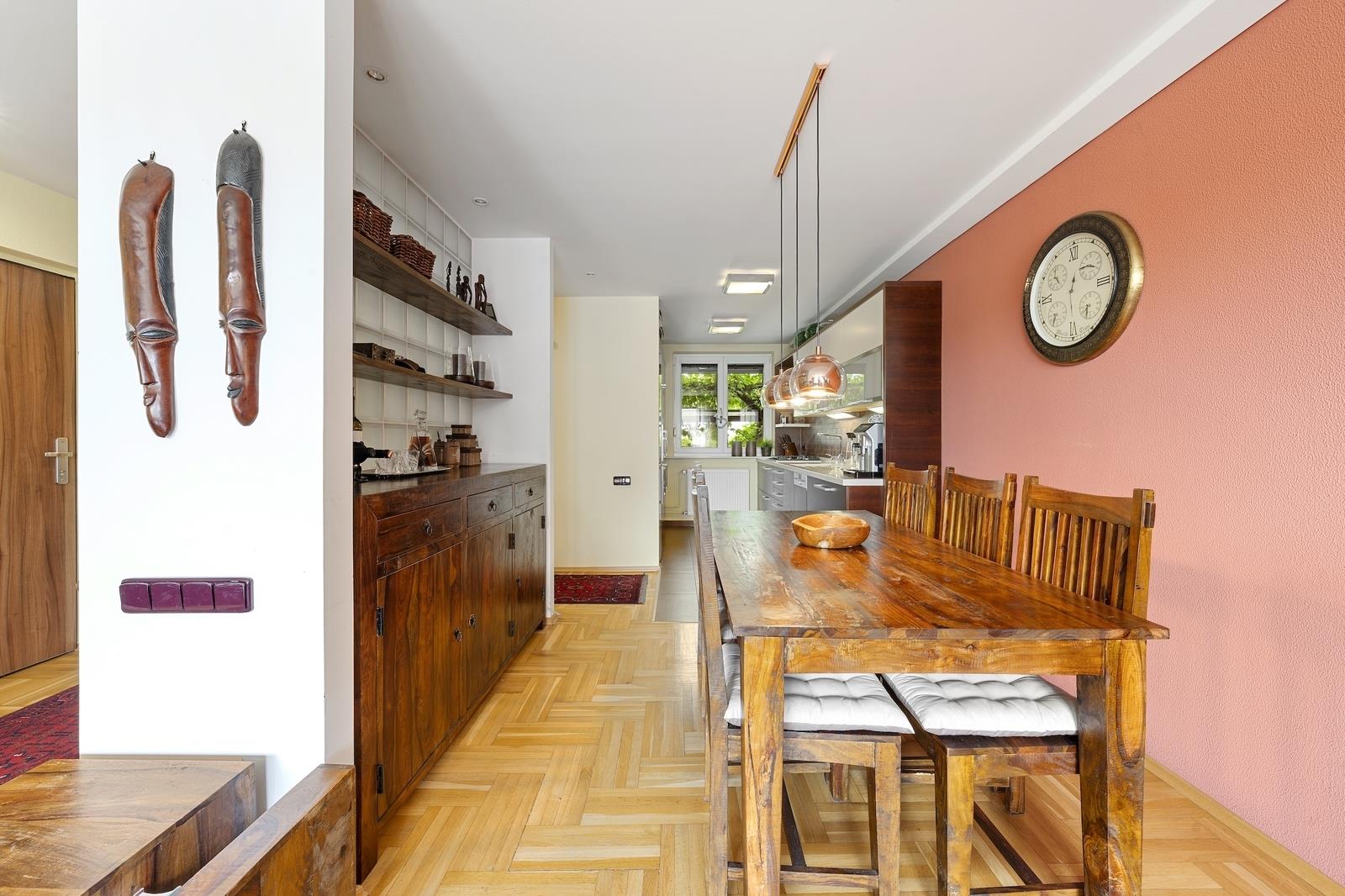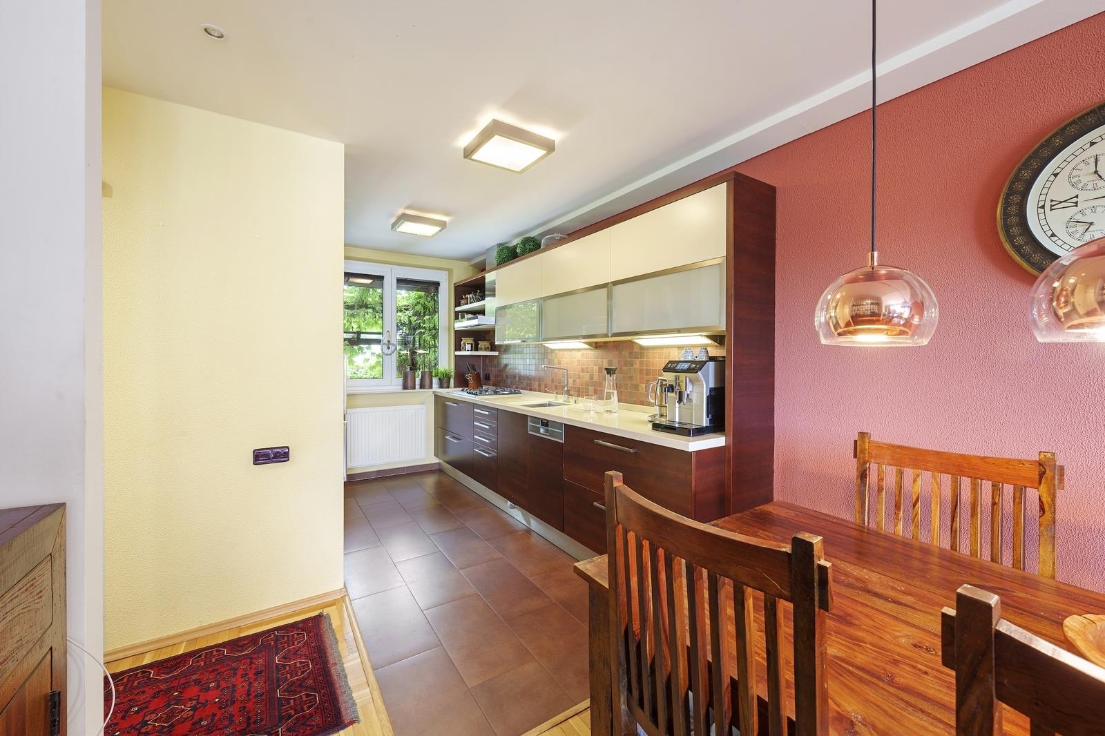 Dominantou domu je světlý obytný prostor s kuchyní a jídelní částí o velikosti 40 m², který přirozeně tvoří srdce celého domova. V přízemí dále najdete pracovnu [18 m²], šatnu o velikosti [13 m²] s vestavěnými skříněmi, koupelnu a samostatné WC. Celková plocha 1.NP činí 84,1 m². V domě na oknech do ulice jsou hliníkové žaluzie, což zajišťuje komfortní regulaci teploty a soukromí. Všechna okna do zahrady mají bezpečnostní rolety, které zvyšují pocit bezpečí. V obou patrech jsou nainstalovány bezpečnostní dveře vč. dveří ze suterénu do zahrady.