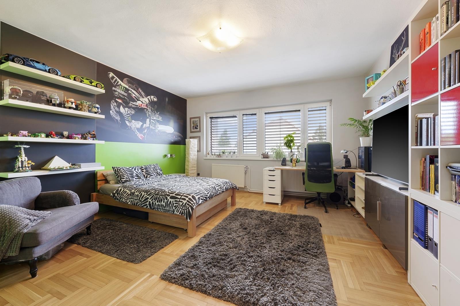 Dům nabízí několik samostatných pokojů, které lze flexibilně využít jako ložnice, pokoje, pracovnu nebo pokoj pro hosty. Ve 2.NP se nachází například ložnice [18 m²] s výstupem na lodžii do zahrady , dětský pokoj [24 m²] se samostatnou klimatizací s dálk. ovládáním nebo pokoj, který se aktuálně využívá jako knihovna [11 m²]. Samostatná šatna s vestavěnými skříněmi [13 m²] je i na tomto podlaží, které je doplněné o další zázemí vč. koupelny s vanou. Velkým benefitem jsou dvě lodžie o celkové ploše 16 m², orientované jak do ulice, tak do zahrady. Celková plocha tohoto podlaží je 88,3 m².