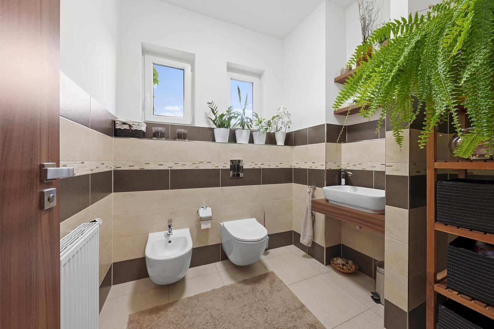 Součástí domu je i prostorný suterén o výměře 86,9 m², který nabízí široké možnosti využití – nachází se zde garáž [29 m²] s vraty ovládanými na dálku, prádelny, kotelna i místnost vhodná jako domácí fitness [13 m²]. Celková užitná plocha domu činí přibližně 259,3 m², což zajišťuje dostatek prostoru i pro větší rodinu nebo vícegenerační bydlení.