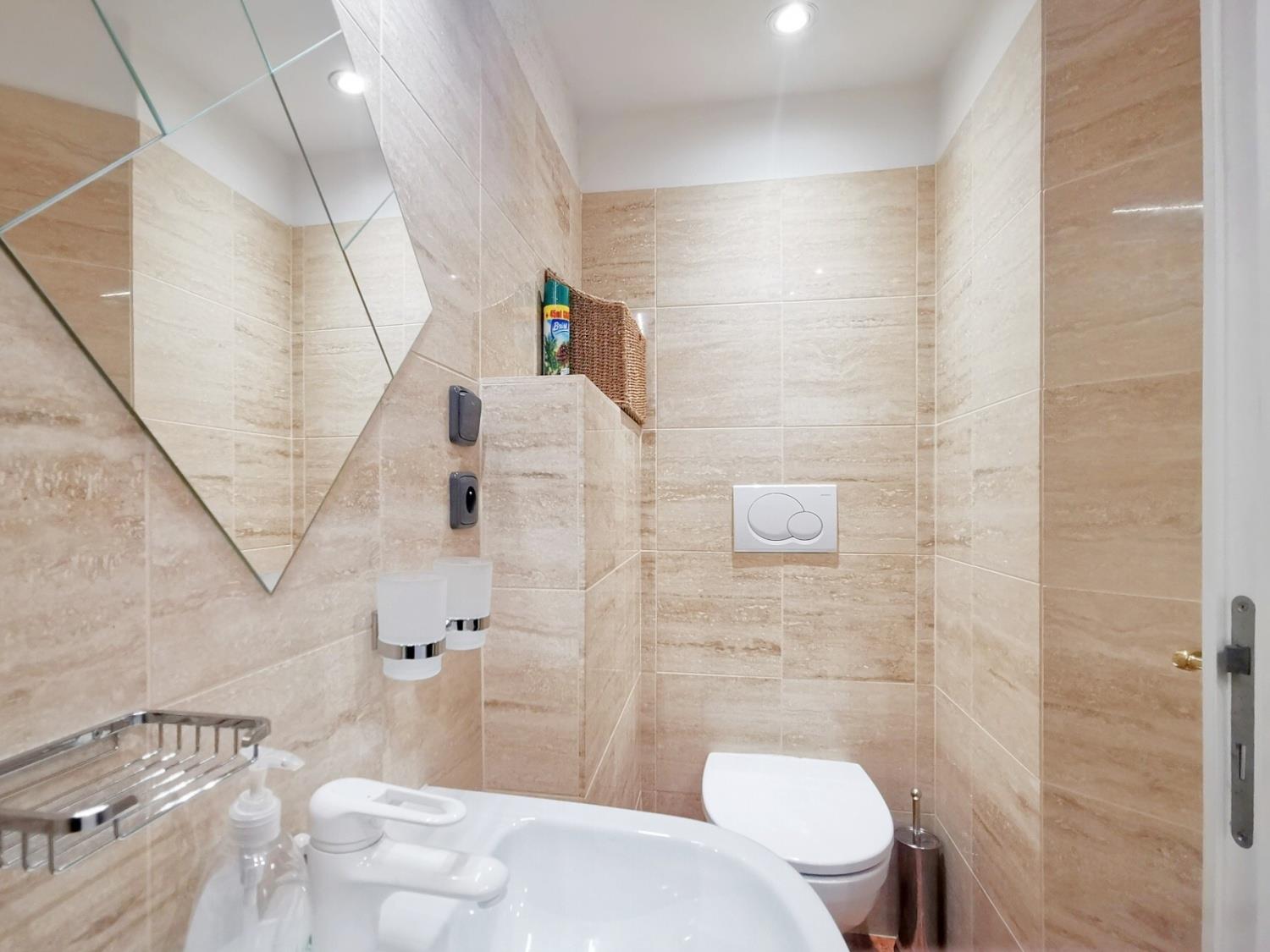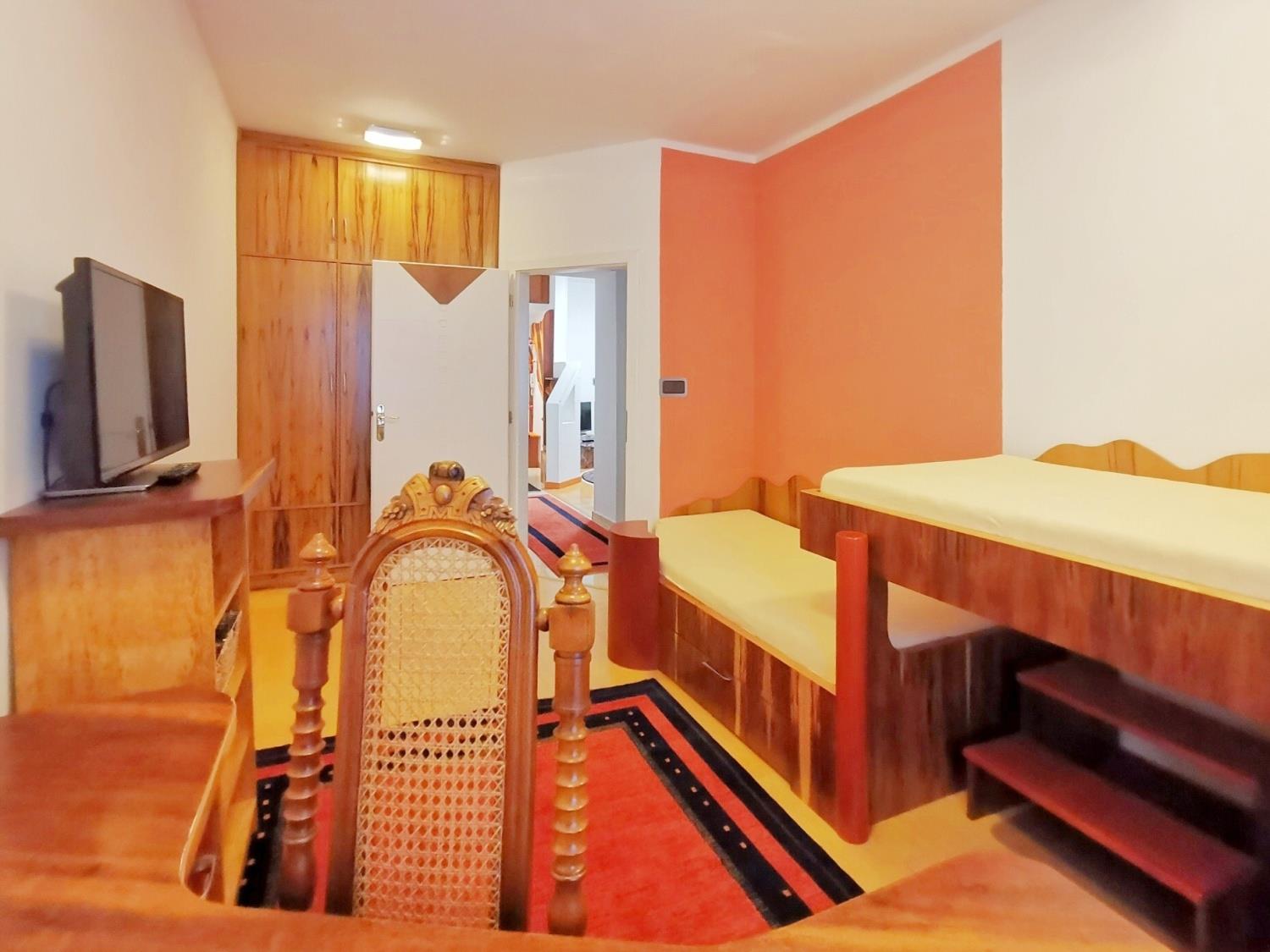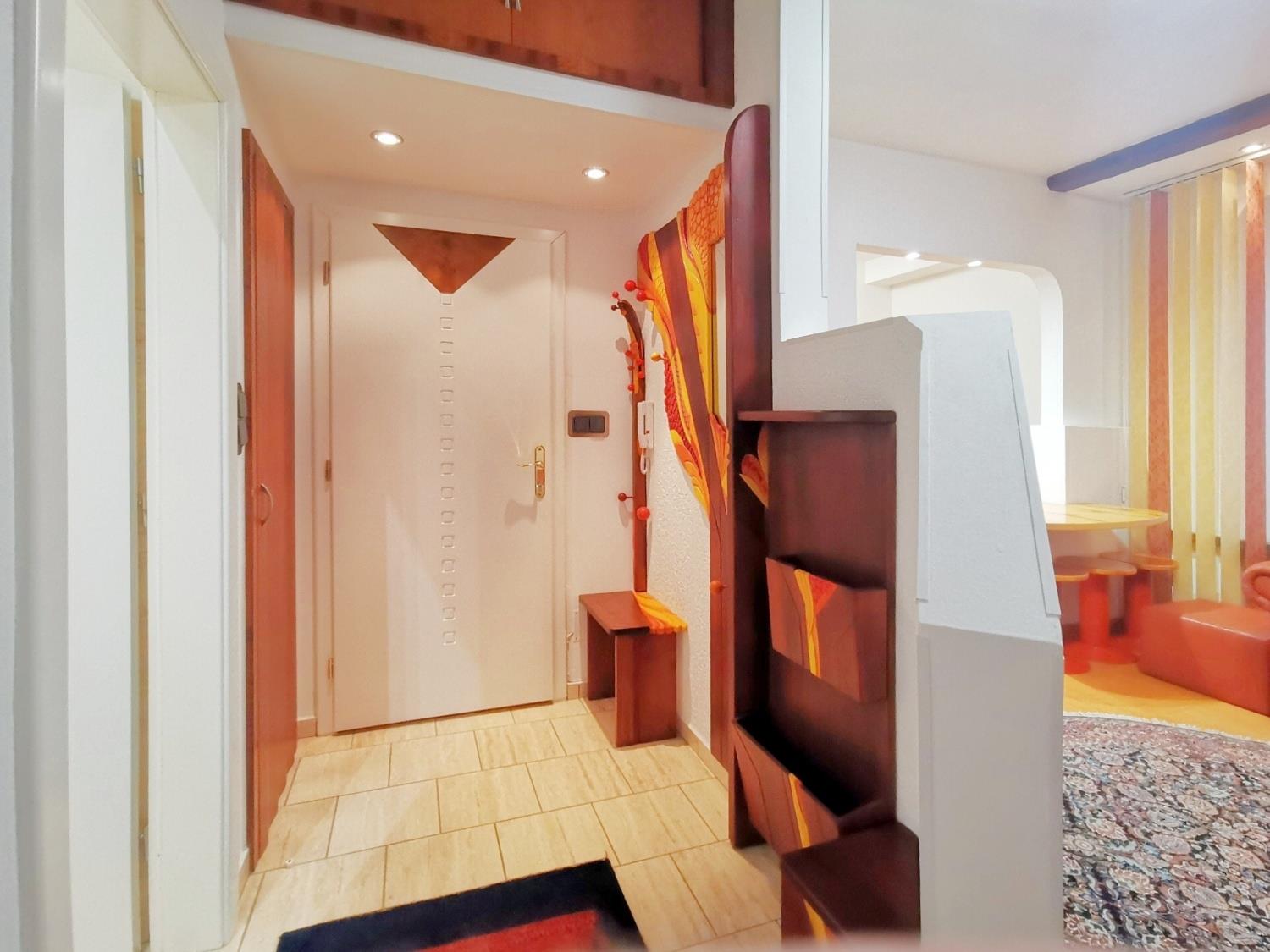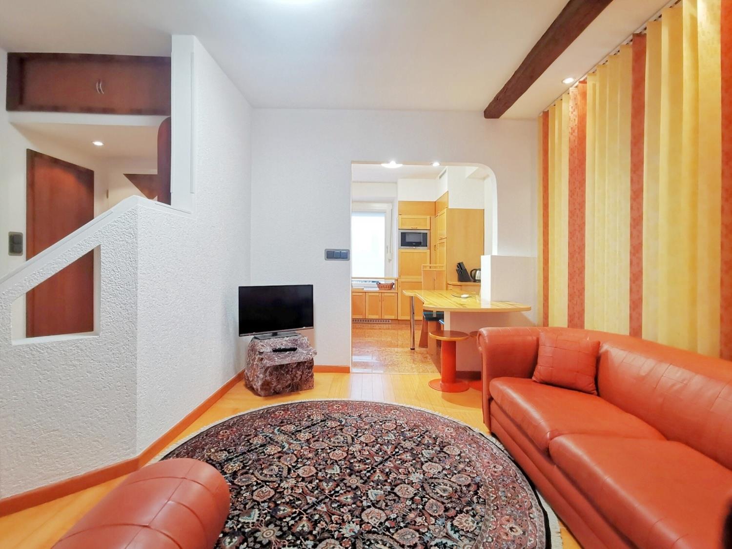 Byt má dvě ložnice, prostorný obývací pokoj propojený s kompletně zařízenou kuchyní, koupelnu a pracovní kout. Dispozice se samostatnými vstupy do všech místností poskytuje maximální komfort a soukromí.